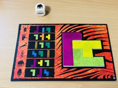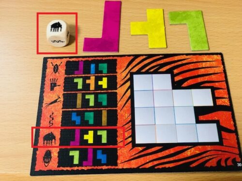 各自、自分の手元にあるパズルボードを表にして置き、お題になった模様のタイルを探してからパズルを完成させてください。