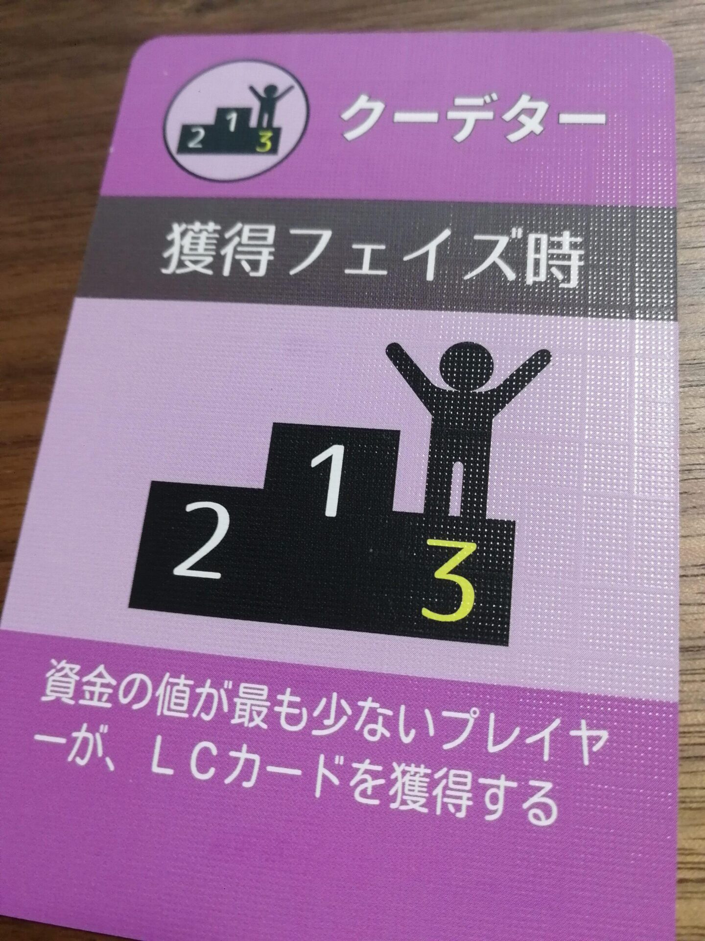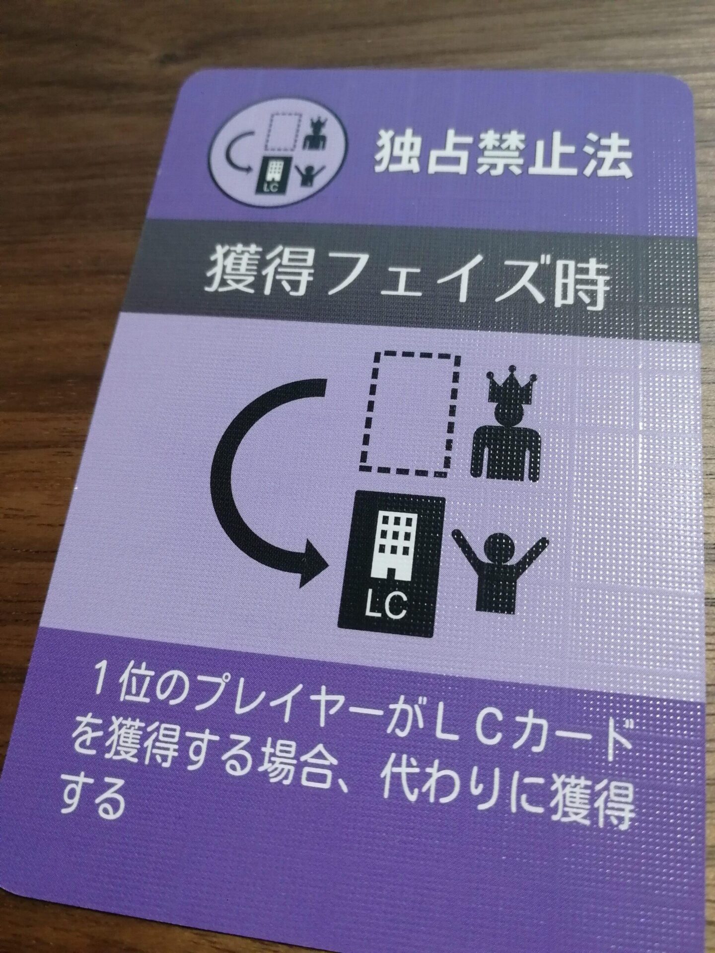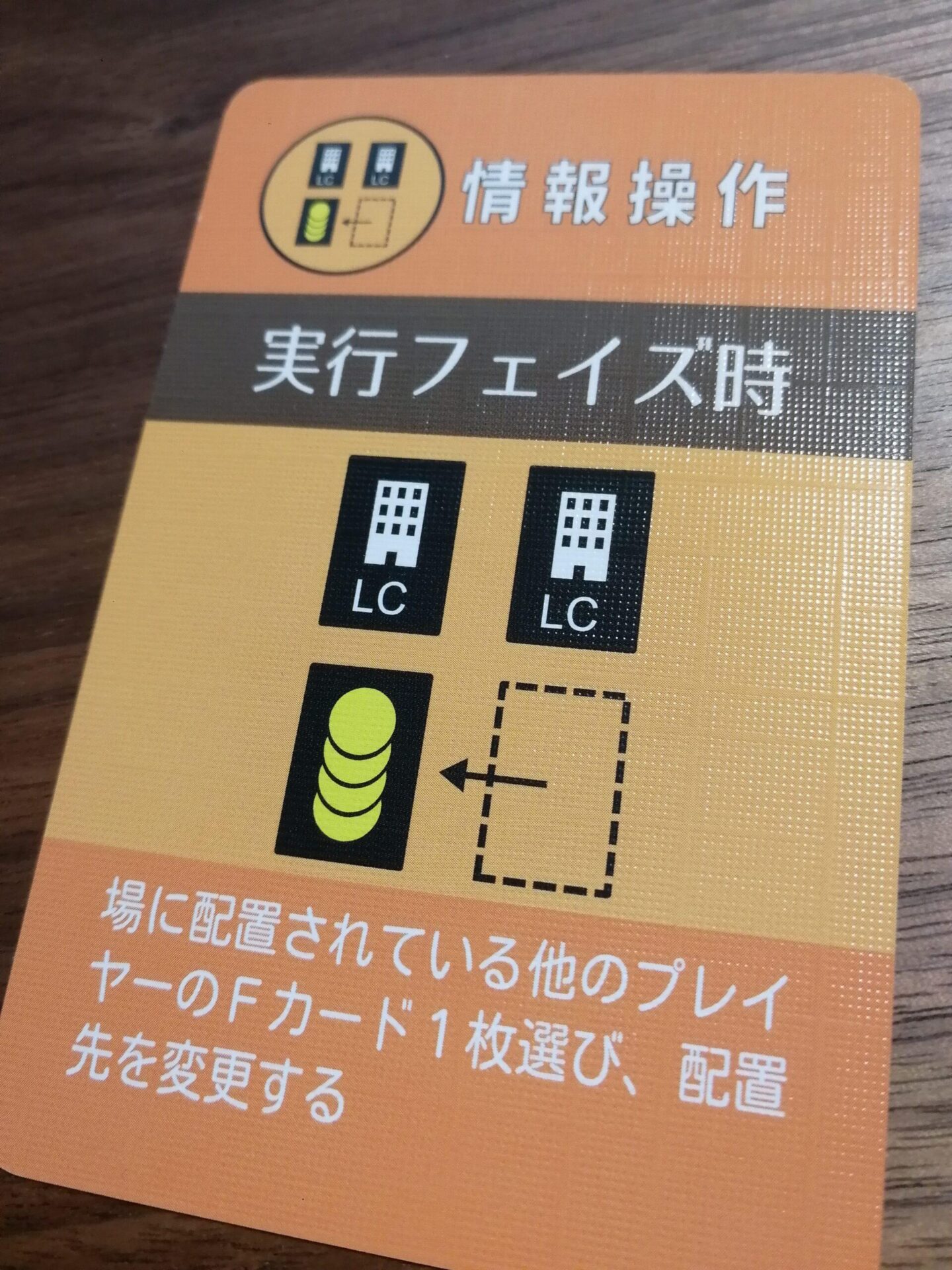 上場企業(LC)カードの山札から選ばれた2 企業のうち、どちらを買収するか選択し、資金(F)カードを1枚提示します。